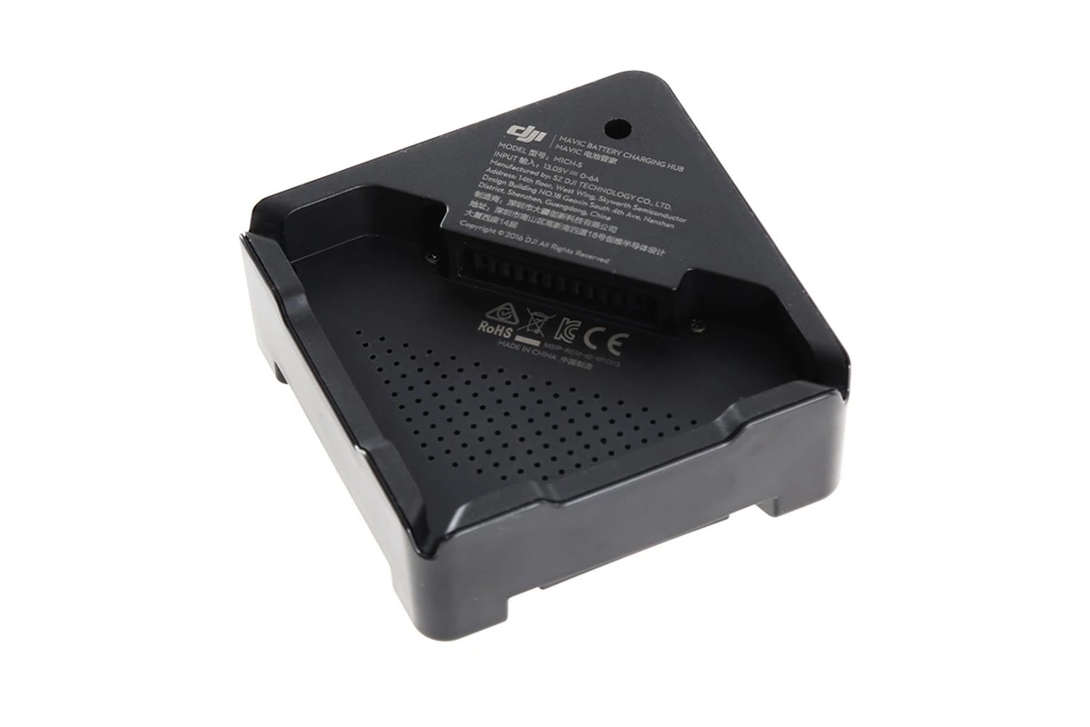 The DJI Mavic Pro battery Charging hub has been designed for use with the DJI Mavic Pro Intelligent Flight Batteries. When used with the Mavic Battery Charger, it can charge up to four Intelligent Flight Batteries. The Intelligent Flight Batteries will be charged in sequence according to their power levels, from the highest to lowest level of charge.