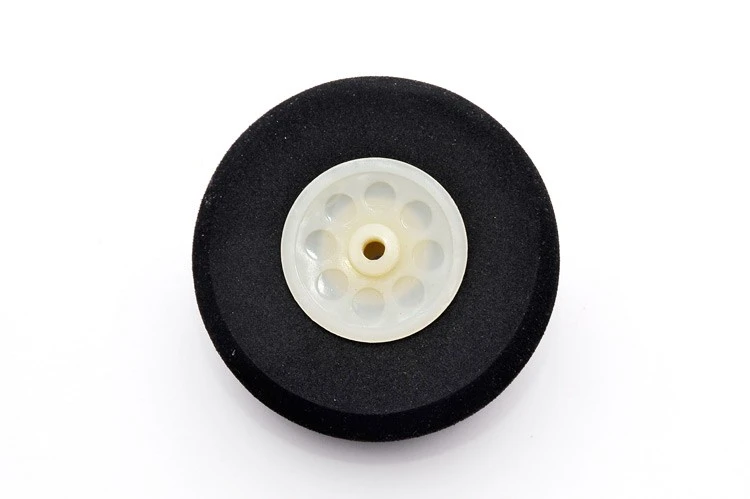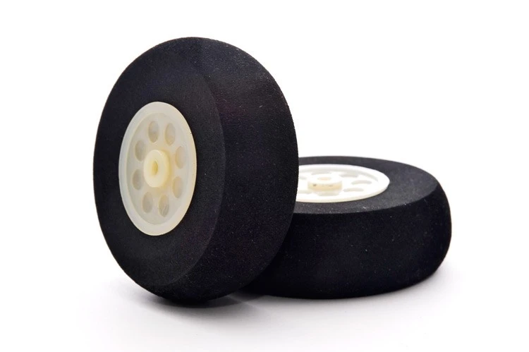 The wheels are made from a high density foam with a plastic hub. The wheel diameter is 70mm, width is approx 25mm with a center hole size of approx 4mm, weight 23 grams (each).