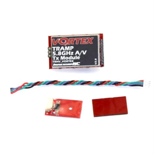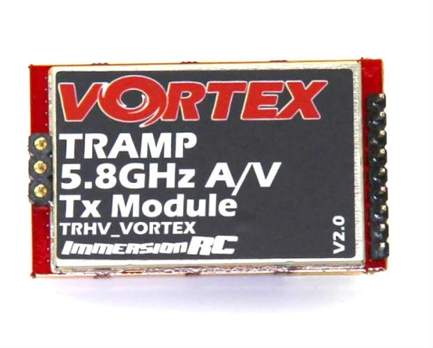 The ImmersionRC Tramp module replaces the video transmitters for the Vortex 250, Vortex 250 Pro, Metall Danny 275 and the Vortex 285 Quadcopters. The ImmersionRC Tramp module works on the 5.8 Ghz band and allows the user to select the power output from 2mW to 600mW. Using this unit allows current ImmersionRC owners to upgrade your vortex to the very latest video transmitter technology. Included with the ImmersionRC Tramp modle is a TNR Tag for installation within the plastic side-plate of the vortex quad.