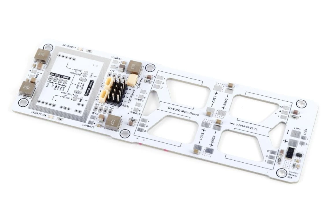 The QAV250 Fury Power Distribution Board (PDB) can also be set up to work as a stand-alone (without CORE). Camera and video transmitters plug easily into the sockets with the provided cables; there are solder pads to connect wires directly if needed. The additional auxiliary power ports make it easy to add in additional systems like alarms, beepers, video transmitters and more. The Fury is made from the same high strength fiberglass-reinforced epoxy laminate as the QAV250 Power Distribution Board. Using the QAV250 Fury Power Distribution Board means that the components are protected inside the “cavity” on the QAV250 platform, and with two additional mounting holes in the front you will see the extra rigidity in the QAV250 Airframes.