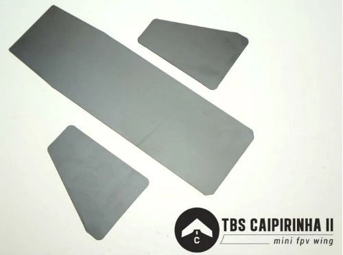 The TBS Caipirinha 2 flying wing replacement foam kit. Supplied with just about every part you will need to for your Caipirinha 2 as a replacement after any damaged caused due to a hard landing or trying to fit through a gap which was not just big enough. This foam kit includes the Caipirinha glass fibre spar set.